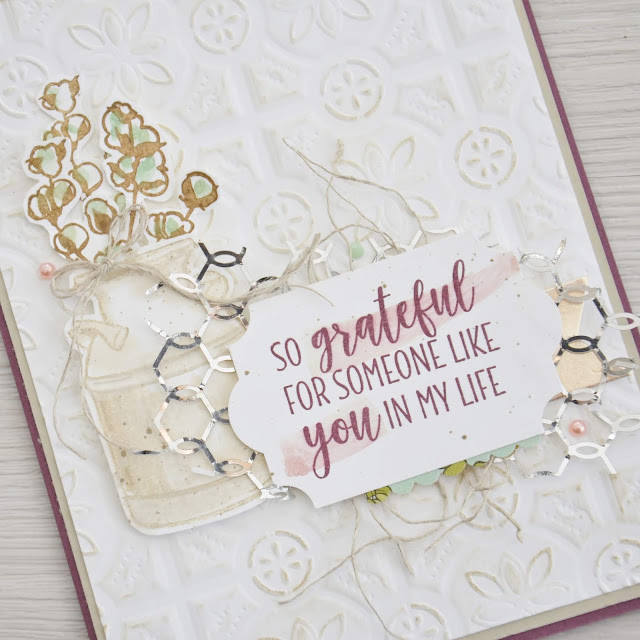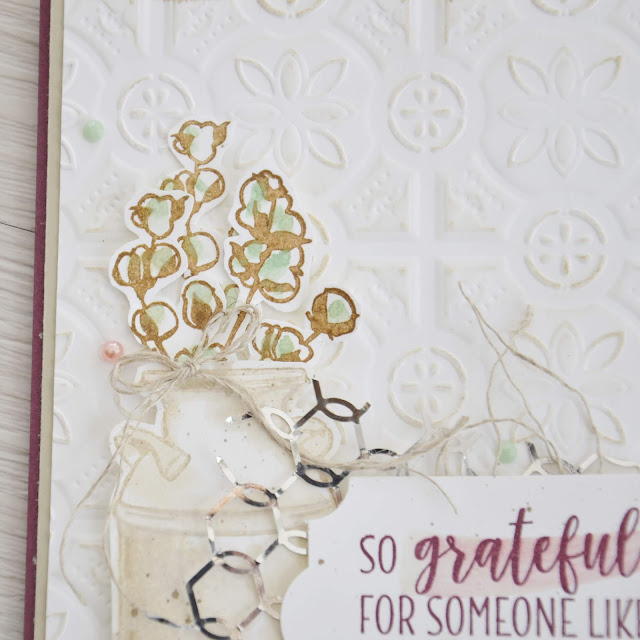 So much to love, right?! Being in the Architecture industry, I am drawn to stamps and paper crafting products that have a construction feel. This Tin Tile Embossing Folder is to die for! I used a Sponge Dauber and Sahara Sand Classic Ink to slightly age the Whisper White Cardstock Tin Tile.
